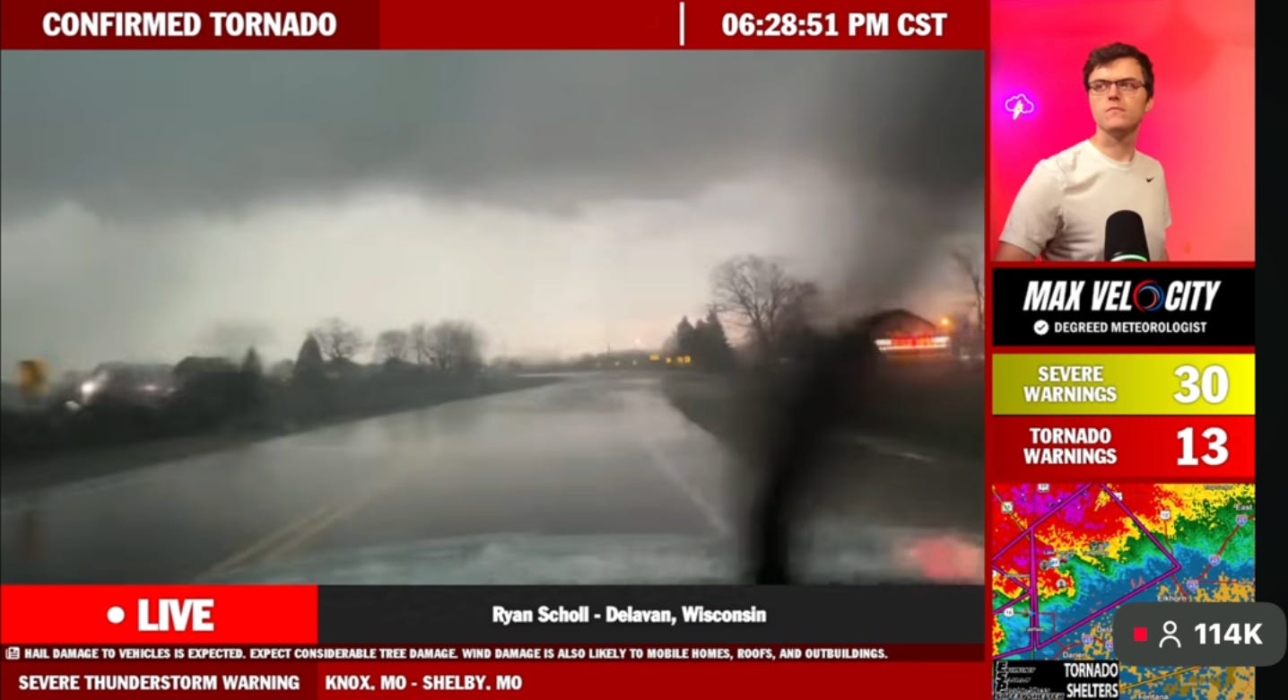 Max Velocity is a meteorologist from Embry-Riddle who started posting forecast videos on YouTube in sixth grade and now has over 1.8 million subscribers. Whenever severe weather threatens anywhere in the United States, he goes live — sometimes for up to six or eight hours — and what he’s built around those streams is genuinely impressive, sometimes identifying tornado threats at the street level before local weather services issue warnings. He taps into a patchwork of Department of Transportation cameras to give viewers real-time ground-level visuals. He coordinates a network of storm chasers whose positions overlay his weather maps — click on any of them and their live video feeds pop up. I was riveted watching live storm chasers race down country roads I biked on as a kid, as the storm moved closer to my mom.