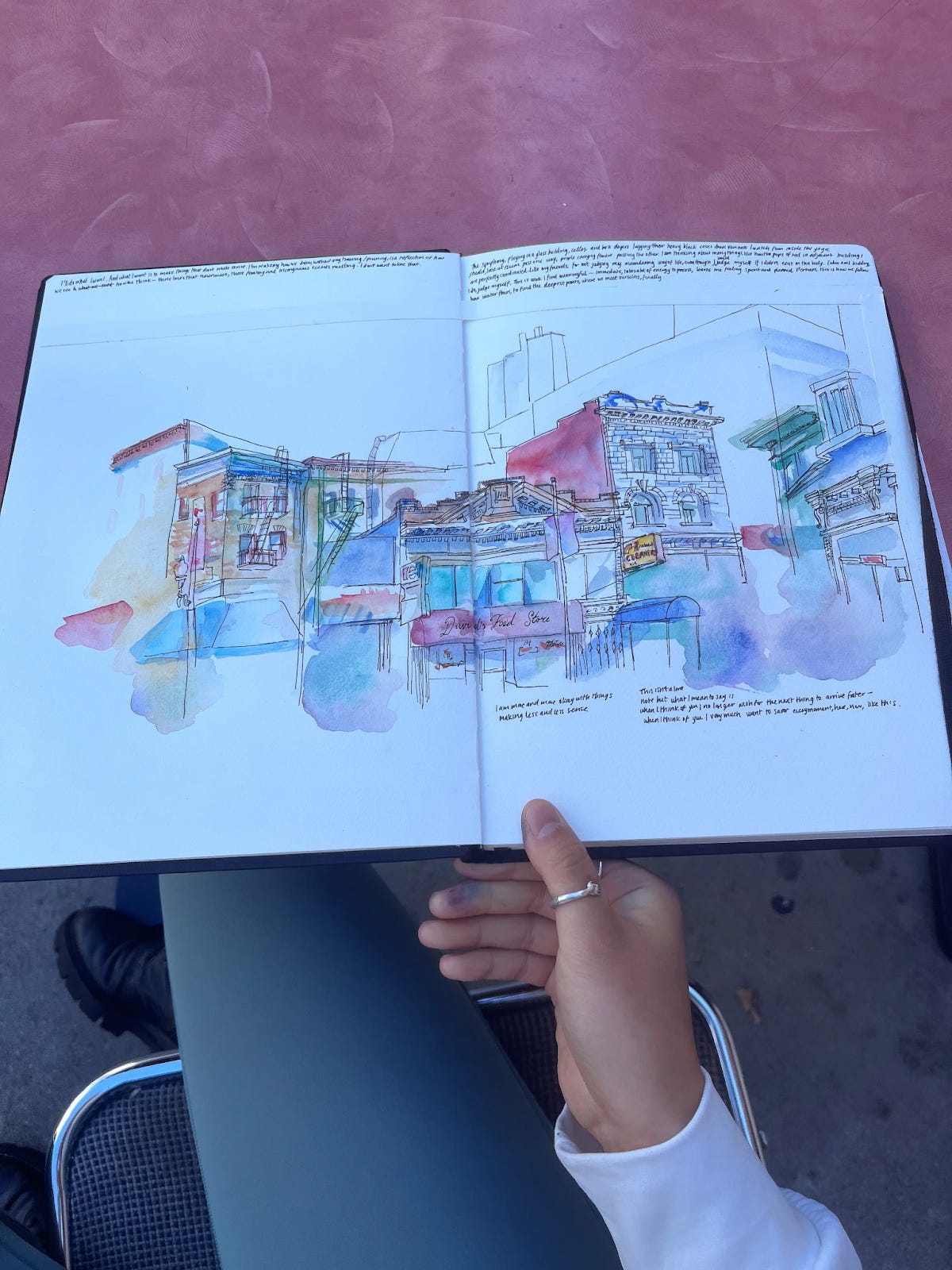 Because I was constantly going to new places - South Korea, India, Berlin, Buenos Aires, I started keeping sketchbooks. I would draw things I saw and write down whatever was on my mind. Sometimes snippets from conversations I’d overhear. It became something I did just for myself, and I was known for it in college. I was always doodling at student concerts, on the bus, at dinners. I’d always carry a sketchbook around.