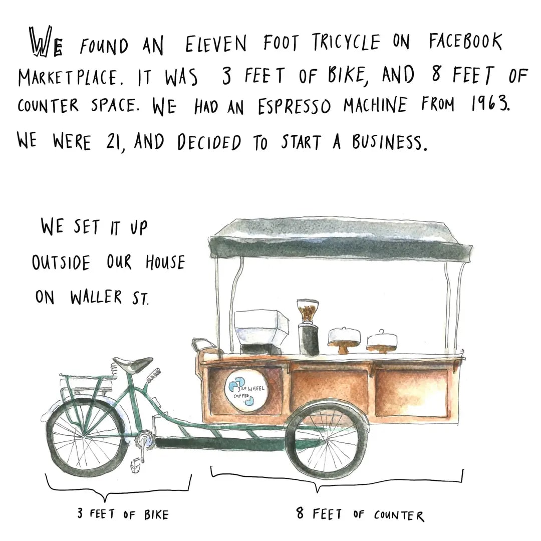 So I decided to start talking to people in my city. I began with local businesses I already knew. The first people I talked to were Tom and Vida. They have a coffee cart near one of the parks. They met working at a coffee shop, fell in love, found a giant tricycle on Facebook Marketplace, installed a coffee counter, and started selling coffee in their neighborhood.