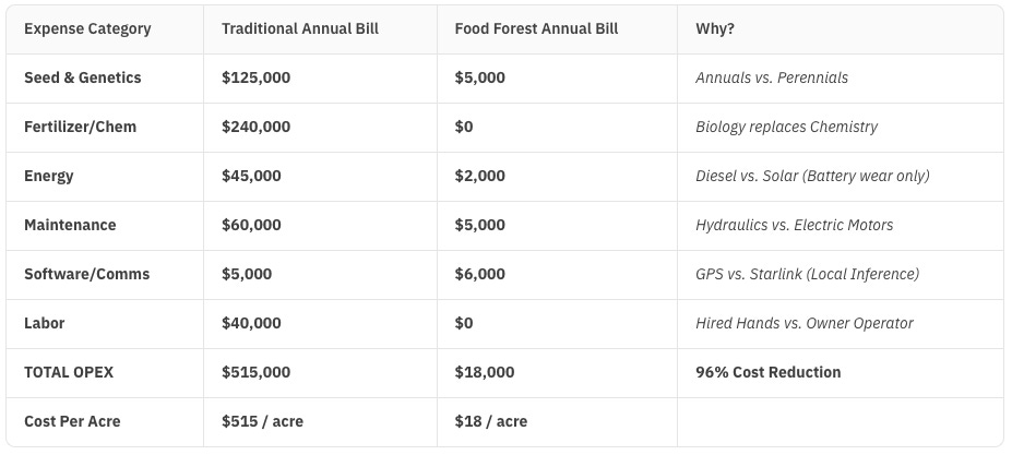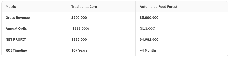 Note: Food Forest revenue figures assume a mature ecosystem (Year 3–5). While the robotic hardware pays for itself in 4 months of full production, the biology requires time to establish.