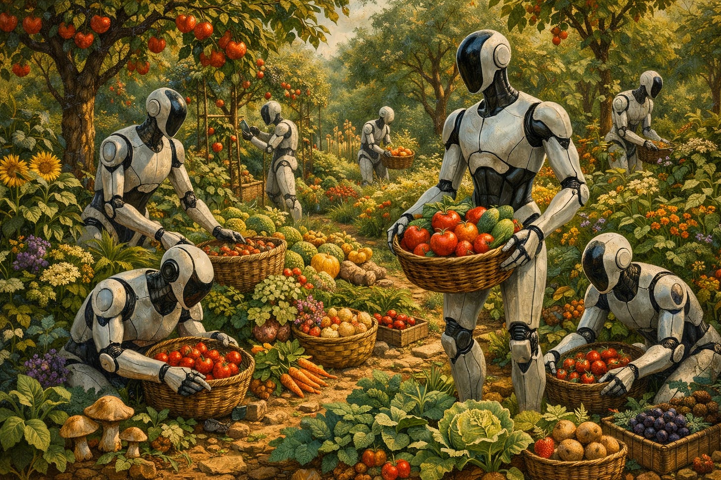 Here’s how it’s going to play out. One enterprising farmer orders an Optimus, figuring it can help with housework. After a while, he’ll ask it for other use cases. The robot accesses the internet, reads this essay, explains my thesis, and makes a suggestion. “After I’m done with the housework, why don’t we start small with a permaculture experiment? Just one acre?” And that’s the first domino. After seeing how cheap and robust it is, the farmer orders a few more robots — and so begins the conversion of his monoculture farm to a complex, year-round, milpa-style permaculture operation.