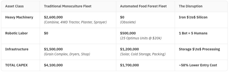 Robot Density & Labor Logic: The allocation of 25 robots is derived from a "First Principles" analysis of available work hours. A human worker is biologically limited to ~1,600 effective hours per year (8-hour shifts, breaks, fatigue, and daylight/sleep restrictions). An Optimus unit, utilizing local inference (no latency) and rapid charging (similar to Tesla’s V4 architecture), is estimated at ~8,000 effective hours per year (22-hour duty cycle, perfect night vision, no fatigue). Therefore, in terms of raw labor availability, 1 Robot $\approx$ 5 Humans. For a 1,000-acre food forest estimated to require ~150,000 annual labor hours, ~19 robots are mathematically required; the model budgets for 25 units to ensure redundancy.
